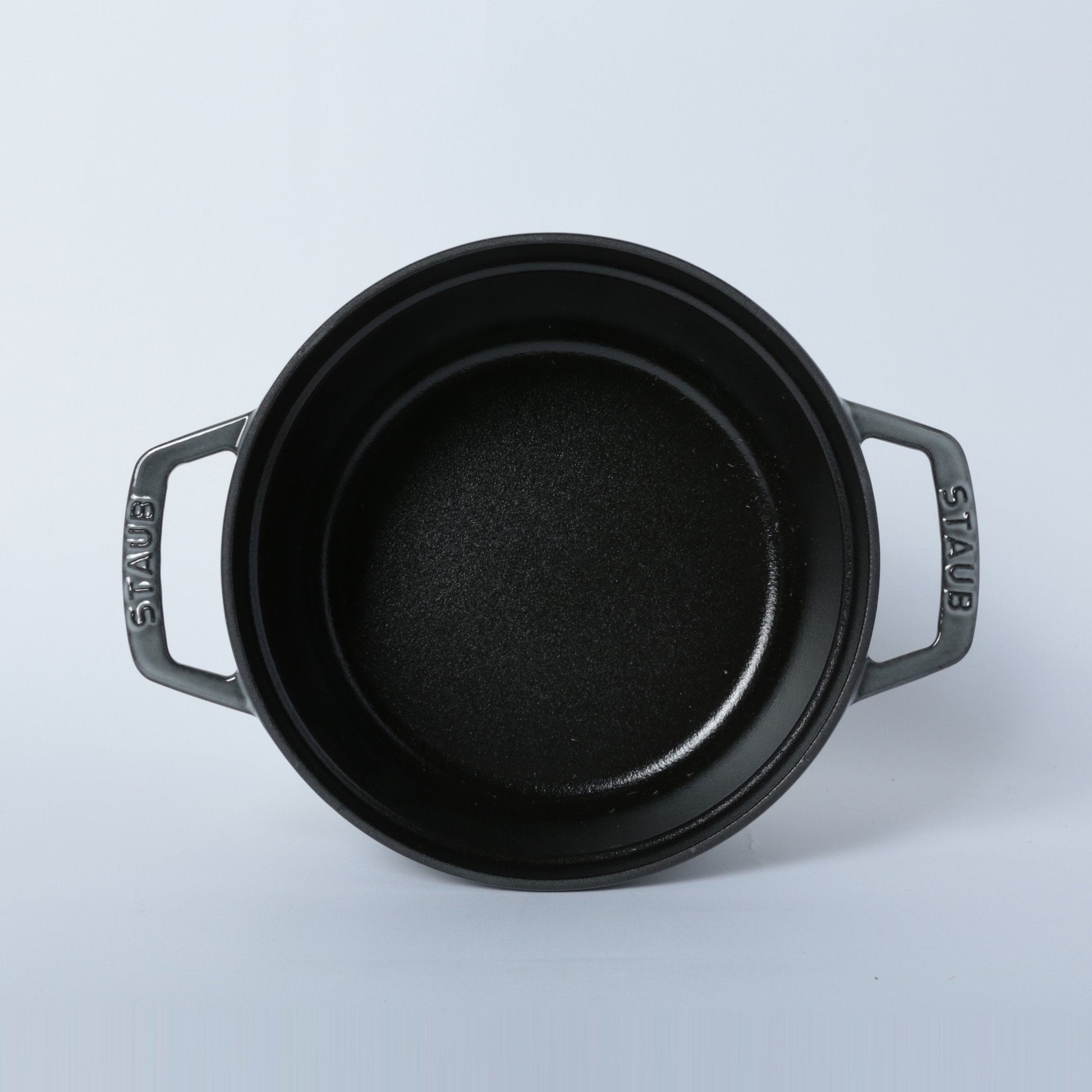 黒マットエマイユ加工:内部はストウブ独自のザラザラ加工。細かな凹凸によって表面積が増えるため油なじみがよく、食材の接点が少なくなり焦げ付きにくくなります。