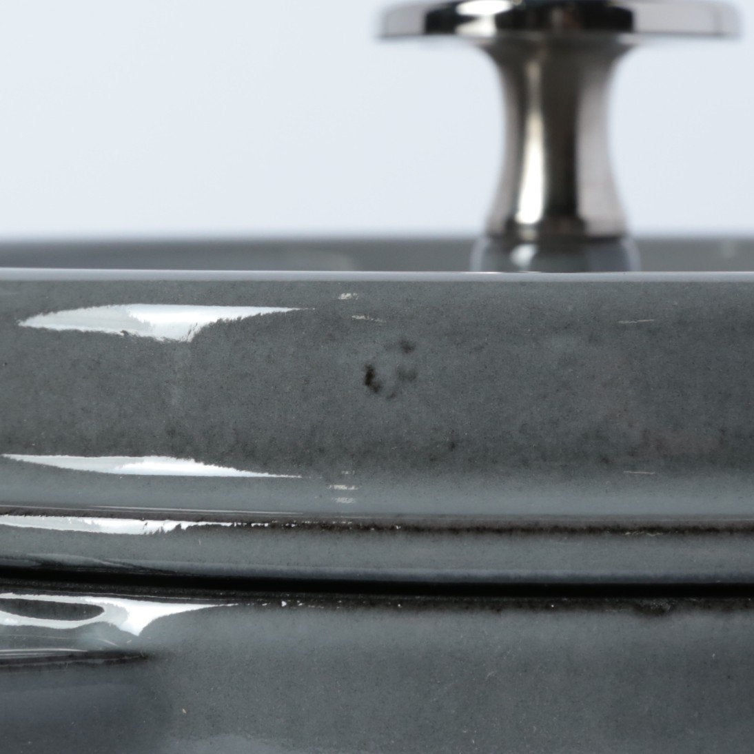 台に載せてエマイユ(ほうろう)加工を施すため、本体の縁や蓋裏に加工時の跡が薄く残ることがありますが、品質に問題なく、ご使用上の支障はございません。