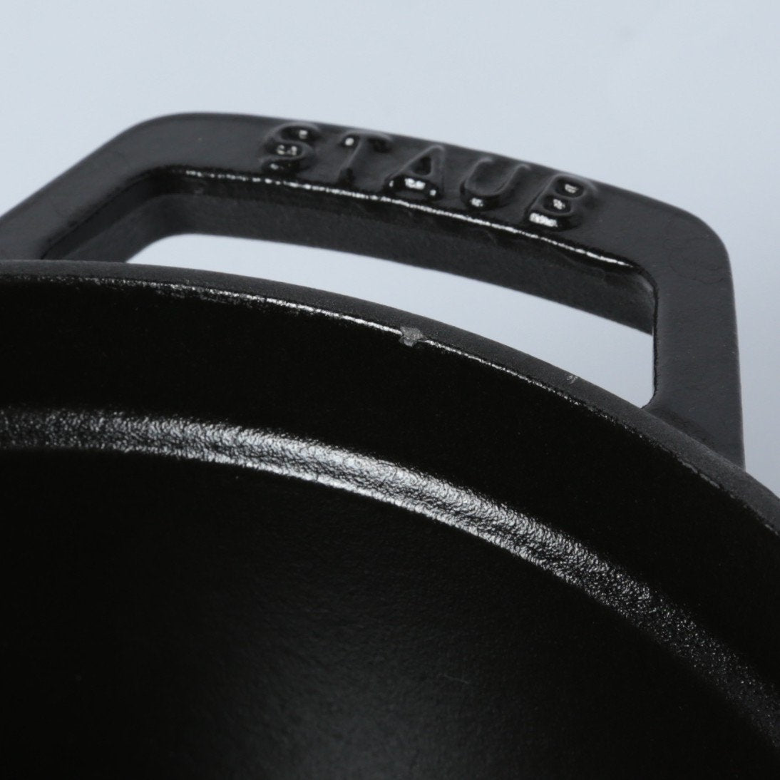 黒マットエマイユ加工:内部はストウブ独自のザラザラ加工。細かな凹凸によって表面積が増えるため油なじみがよく、食材の接点が少なくなり焦げ付きにくくなります。