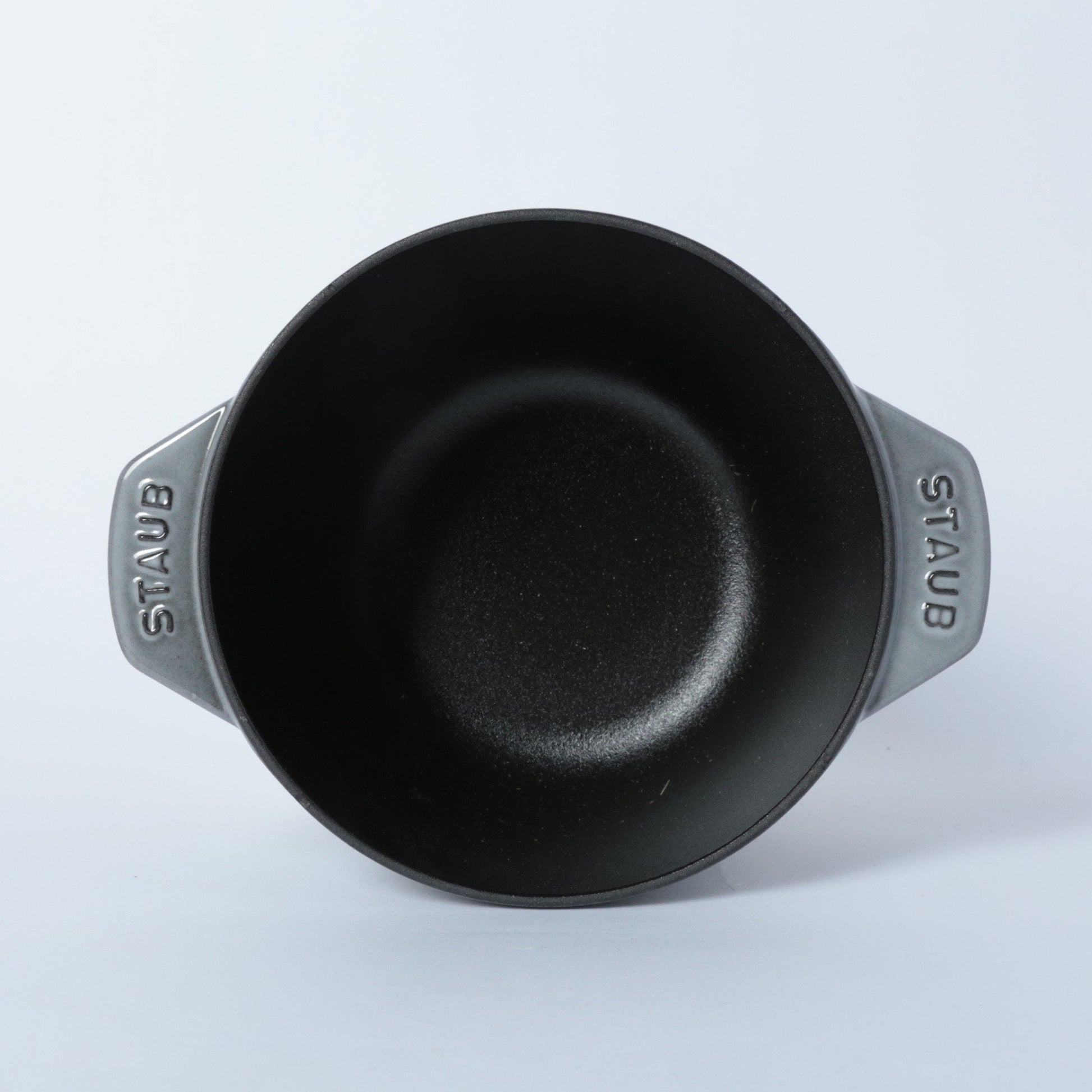黒マットエマイユ加工:内部はストウブ独自のザラザラ加工。細かな凹凸によって表面積が増えるため油なじみがよく、食材の接点が少なくなり焦げ付きにくくなります。