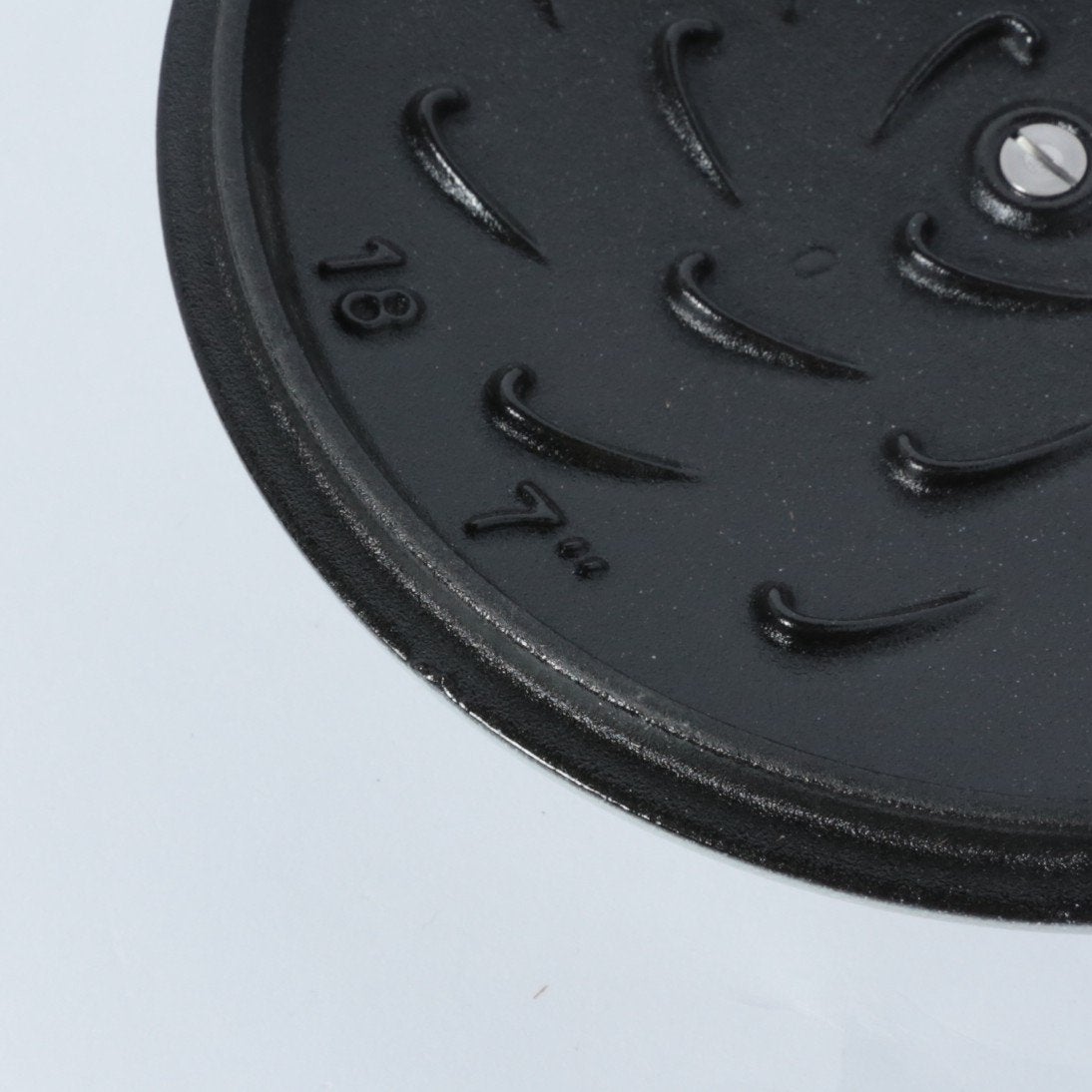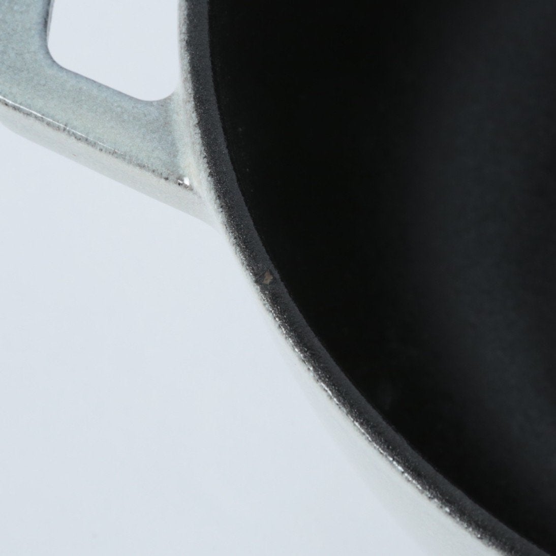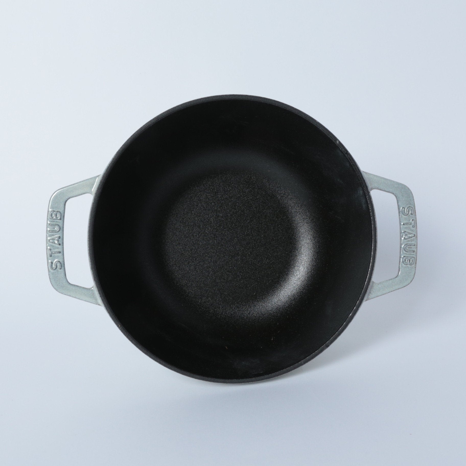 黒マットエマイユ加工:内部はストウブ独自のザラザラ加工。細かな凹凸によって表面積が増えるため油なじみがよく、食材の接点が少なくなり焦げ付きにくくなります。 更に熱伝導・保温性が高くテーブルにそのまま出しても温かいまま料理を楽しめます。