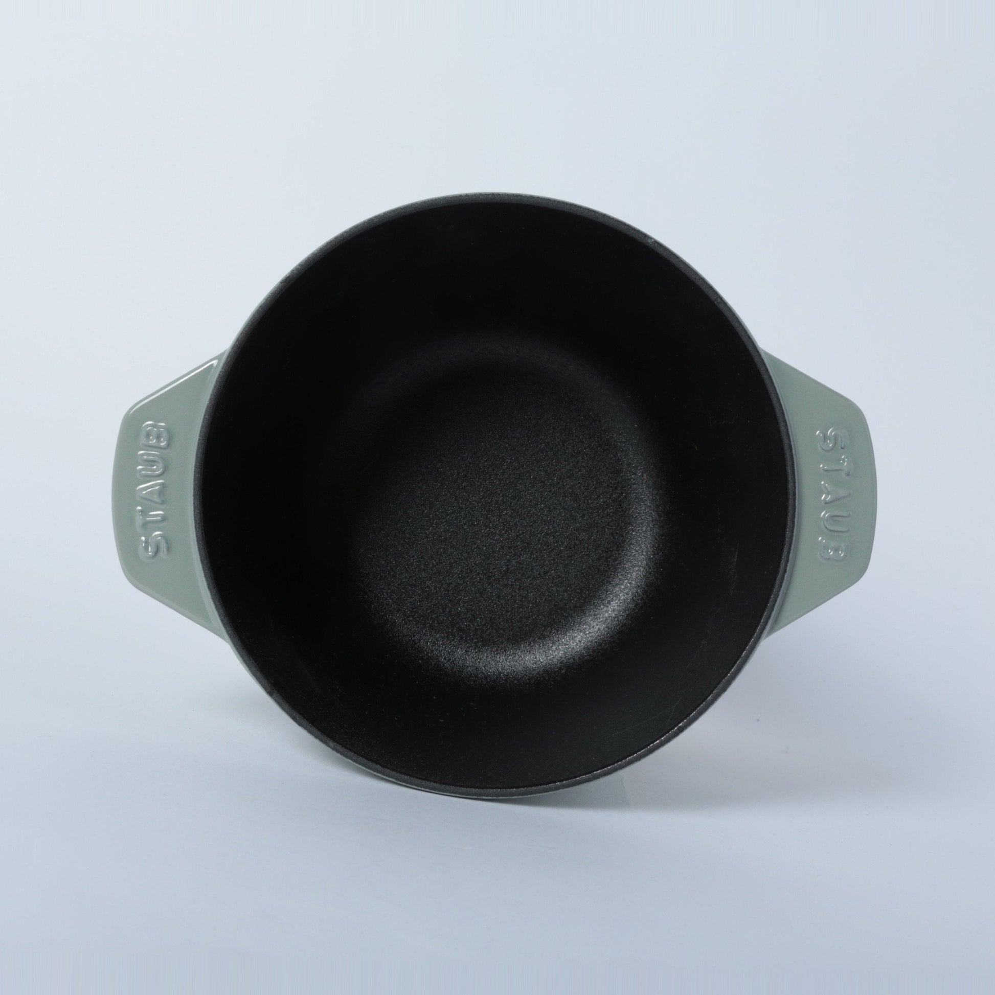 黒マットエマイユ加工:内部はストウブ独自のザラザラ加工。細かな凹凸によって表面積が増えるため油なじみがよく、食材の接点が少なくなり焦げ付きにくくなります。更に熱伝導・保温性が高くテーブルにそのまま出しても温かいまま料理を楽しめます。