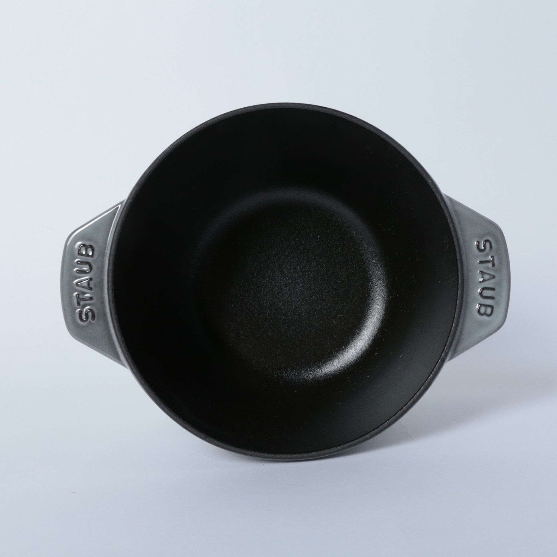 黒マットエマイユ加工:内部はストウブ独自のザラザラ加工。細かな凹凸によって表面積が増えるため油なじみがよく、食材の接点が少なくなり焦げ付きにくくなります。