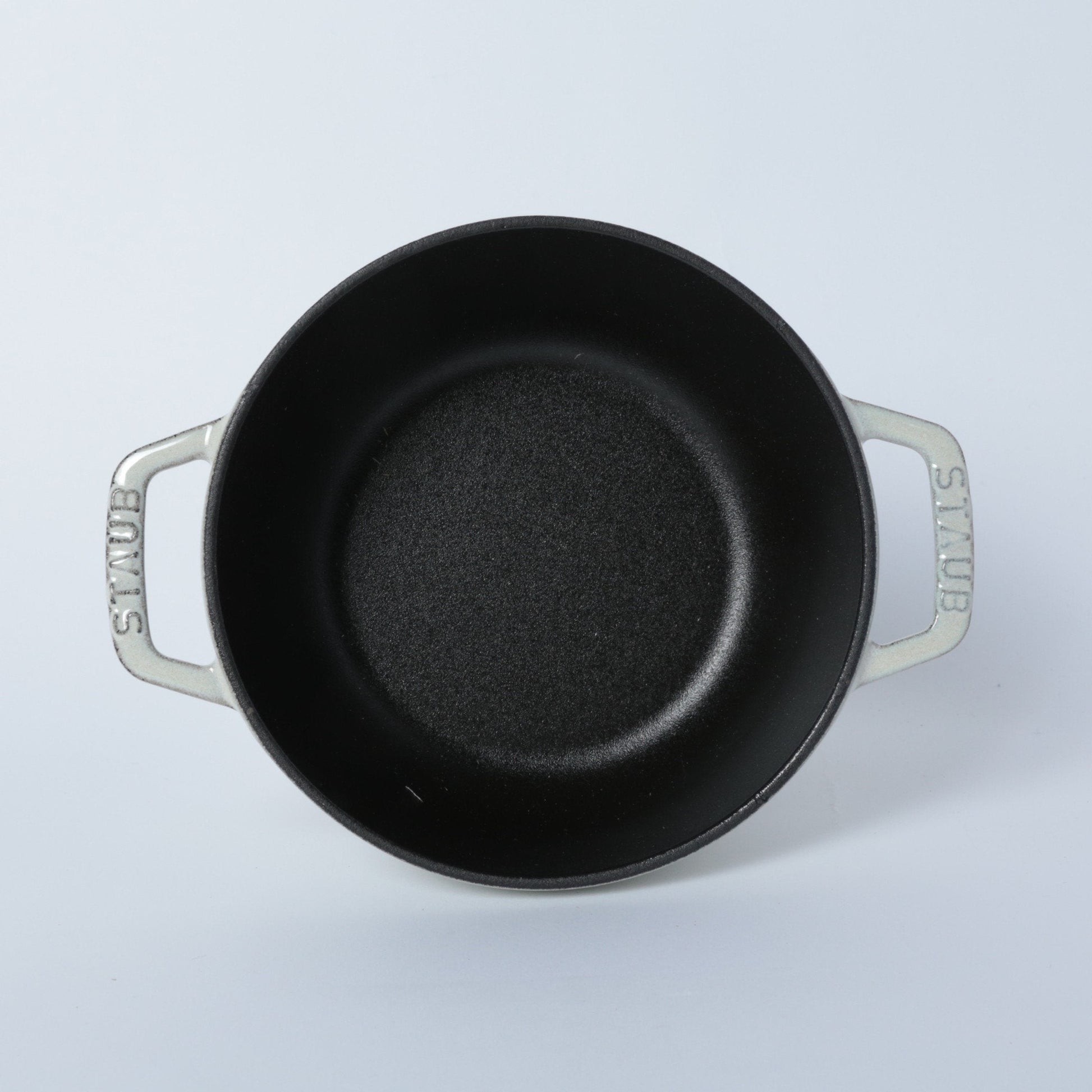黒マットエマイユ加工:内部はストウブ独自のザラザラ加工。細かな凹凸によって表面積が増えるため油なじみがよく、食材の接点が少なくなり焦げ付きにくくなります。 更に熱伝導・保温性が高くテーブルにそのまま出しても温かいまま料理を楽しめます。